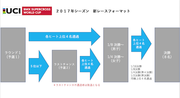 今年からワールドカップシリーズはレースフォーマットが変更されている。各選手最初のラウンドを走り、各組トップ4名が通過。(今回は男子1/8決勝、女子1/4決勝へ進出)。5位以下の選手はラストチャンスクオリファイ(LCQ)へ回り、そのメンバーの中で組合せが行われ、各組トップ4名が通過。(男子1/8決勝、女子1/4決勝へ)その後は各組1発勝負となり、上位4名ずつが次へ進出するトーナメントを経て決勝メンバー8人が出揃い勝者を決める。